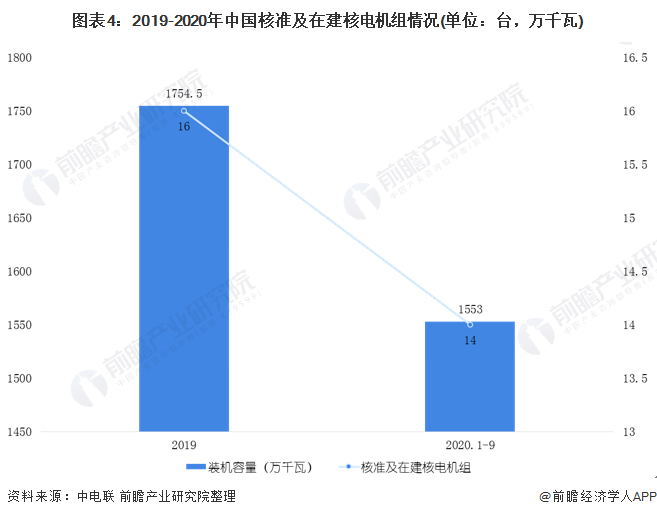 根據(jù)中電聯(lián)的數(shù)據(jù)顯示,截至2019年底,我國核準(zhǔn)及在建核電機(jī)組16臺(tái),裝機(jī)容量1754.5萬千瓦,位居世界第一。而截止到2020年9月底,在建核電機(jī)組14臺(tái),總裝機(jī)容量1553萬千瓦。