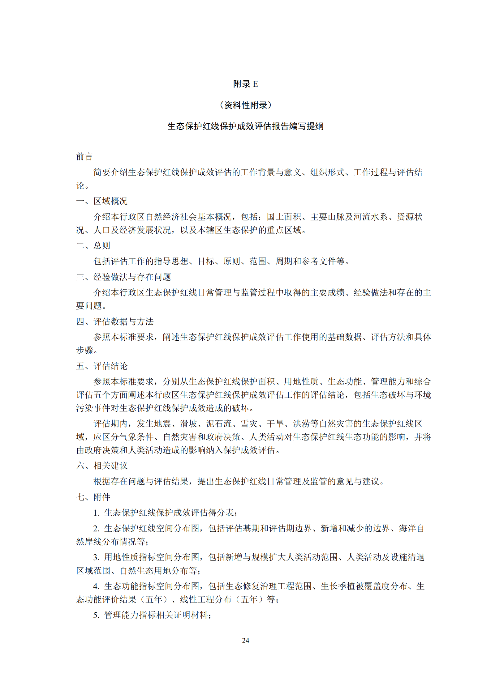 為貫徹落實(shí)《中華人民共和國(guó)環(huán)境保護(hù)法》《中共中央辦公廳 國(guó)務(wù)院辦公廳關(guān)于劃定并嚴(yán)守生態(tài)保護(hù)紅線的若干意見(jiàn)》要求,規(guī)范生態(tài)保護(hù)紅線保護(hù)成效評(píng)估的技術(shù)要求,制定本標(biāo)準(zhǔn)。本標(biāo)準(zhǔn)規(guī)定了生態(tài)保護(hù)紅線保護(hù)成效評(píng)估的評(píng)估周期、評(píng)估目標(biāo)與方式、評(píng)估指標(biāo)與計(jì)算方法、綜合指數(shù)計(jì)算方法與分級(jí)標(biāo)準(zhǔn)的具體要求。本標(biāo)準(zhǔn)附錄 A、C、E 為資料性附錄,附錄 B、D 為規(guī)范性附錄。本標(biāo)準(zhǔn)為首次發(fā)布。
