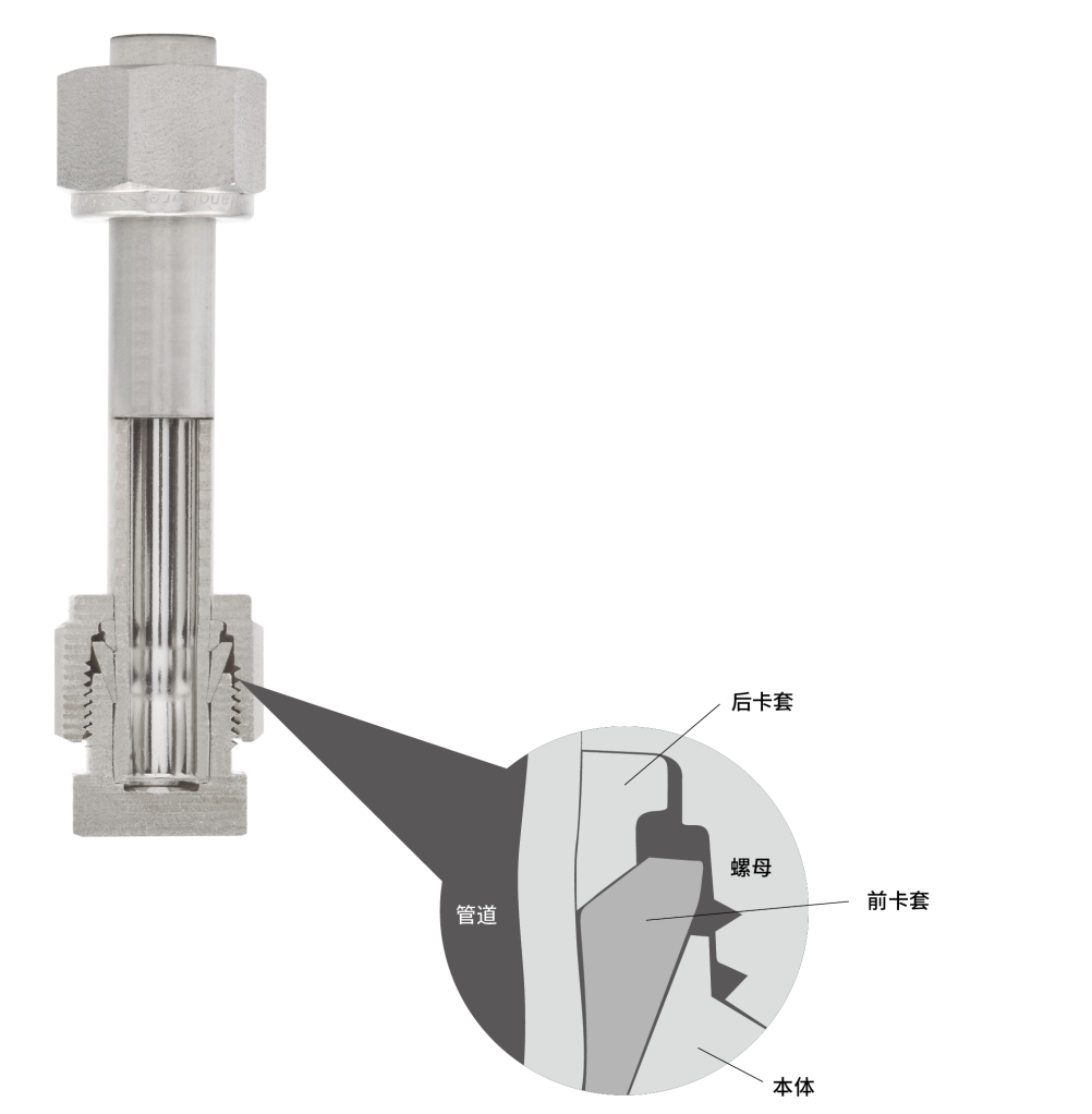 在如上的裝配過程中,前卡套被打入裝配體和管道中,以形成主密封,而后卡套向內(nèi)鉸鏈,以形成對(duì)管道的有力抓握。后卡套的幾何結(jié)構(gòu)允許改進(jìn)的工程鉸鏈夾頭作用,將軸向運(yùn)動(dòng)轉(zhuǎn)化為管子上的徑向擠鍛作用,但在裝配扭矩要求較低的情況下工作。