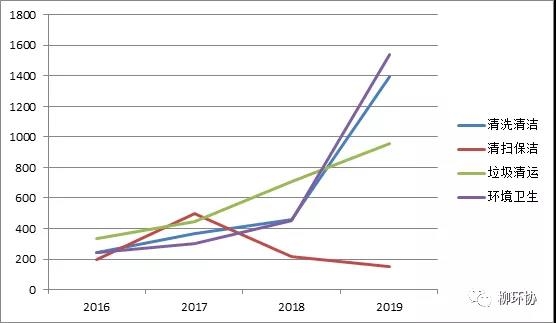 值得注意的是在清掃保潔領(lǐng)域,在經(jīng)歷了2017年的頂峰之后,呈現(xiàn)出與眾不同的下降趨勢。
