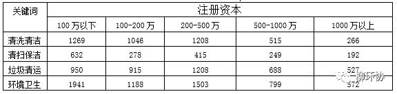 根據(jù)主要會員單位的經(jīng)營范圍,篩選提煉出四個關(guān)鍵詞分別是:1、清洗清潔;2、清掃保潔;3、垃圾清運;4、環(huán)境衛(wèi)生。以天眼查為主要檢索工具,所有數(shù)據(jù)也均來源于天眼查。以四個關(guān)鍵詞分別檢索時,企業(yè)會存在一定的重疊度,整體存在的趨勢是,行業(yè)規(guī)模較大的企業(yè),對四個關(guān)鍵詞的覆蓋面越高,反之亦然。