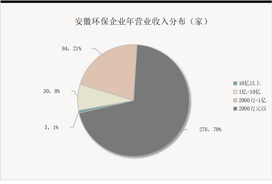 根據(jù)安徽省環(huán)境保護(hù)產(chǎn)業(yè)發(fā)展促進(jìn)會(huì)近日發(fā)布的《安徽省環(huán)保產(chǎn)業(yè)發(fā)展?fàn)顩r報(bào)告(2019)》,2019年,安徽省列入調(diào)查的395家環(huán)保企業(yè)實(shí)現(xiàn)營(yíng)業(yè)收入總額268.18億元。