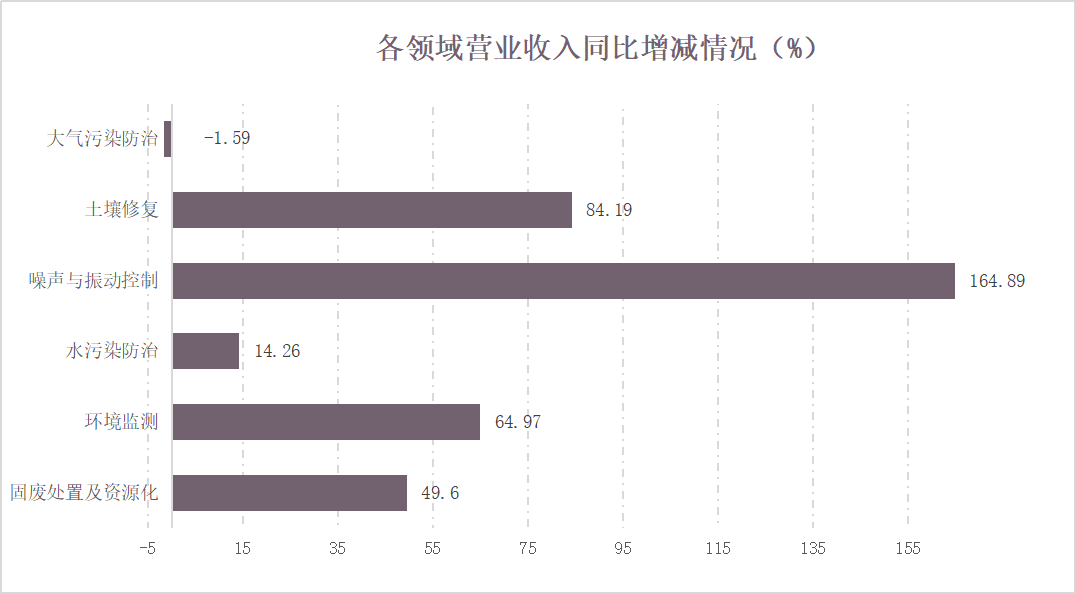 從環(huán)保業(yè)務(wù)營(yíng)業(yè)收入看,噪聲與振動(dòng)控制領(lǐng)域増長(zhǎng)幅度最大,2019年噪聲與振動(dòng)控制領(lǐng)域營(yíng)業(yè)收入為1.0511億元,與2018年相比同比增長(zhǎng)了164.89%,其次是土壤修復(fù)和環(huán)境監(jiān)測(cè)領(lǐng)域,同比增長(zhǎng)了84.19%和64.97%。