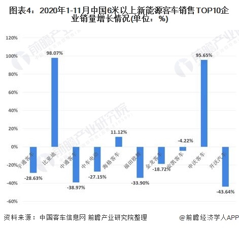 從銷量前10企業(yè)的銷售增長情況來看,2020年1-11月份,在新能源客車行業(yè)市場整體銷量大幅縮減背景下,僅有比亞迪、海格客車和申沃客車三家企業(yè)實現(xiàn)正增長,其中比亞迪增長率達到98.07%,逆勢增長的勢頭迅猛。