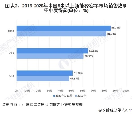 根據(jù)中國客車信息網(wǎng)統(tǒng)計的2020年1-11月份國內(nèi)6米以上新能源客車銷售數(shù)量情況,前十企業(yè)的市場份額達到85.79%,前五企業(yè)市場份額為65.14%,前三企業(yè)超過50%,并且都高于2019年市場集中度數(shù)值,反映出國內(nèi)新能源客車市場頭部企業(yè)競爭優(yōu)勢突出,市場高度集中。