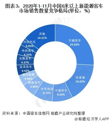 從具體競爭企業(yè)來看,宇通客車占據(jù)絕對市場領(lǐng)先優(yōu)勢,2020年1-11月銷售數(shù)量達到1.26萬輛,市場份額為25.92%,超過排名第二的比亞迪新能源客車銷量的一半,前三家企業(yè)宇通、比亞迪和中通市場份額達到51.20%。