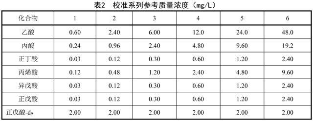 4.16 羧酸標(biāo)準(zhǔn)貯備液:乙酸ρ=20.0g/L,丙酸ρ=8.00g/L,丙烯酸ρ=4.00g/L,正丁酸、異戊酸和正戊酸ρ=1.00g/L。