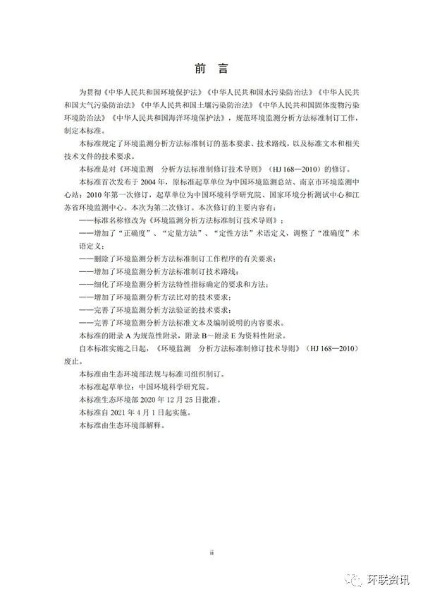 自本標準實施之日起,《環(huán)境監(jiān)測分析方法標準制修訂技術導則》(HJ 168—2010) 廢止。本標準由生態(tài)環(huán)境部法規(guī)與標準司組織制訂。本標準生態(tài)環(huán)境部 2020 年 12 月 25 日批準。