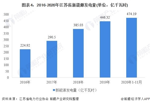 2020年1-11月份,江蘇全省發(fā)電量4533.71億千瓦時,其中新能源發(fā)電量474.19億千瓦時,占全省發(fā)電量的10.46%,份額占比進一步提升。