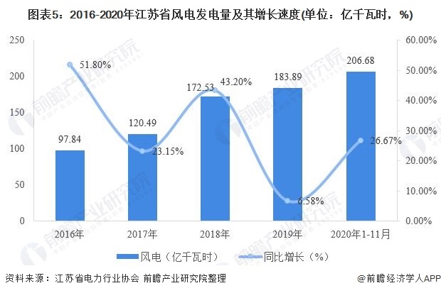 具體到不同類型發(fā)電量來看,江蘇省新能源發(fā)電量主要來自風(fēng)電及太陽能光伏發(fā)電。2016-2020年,江蘇省風(fēng)電發(fā)電量發(fā)展迅速,2016年全省風(fēng)電發(fā)電量僅97.84億千瓦時,到2019年增長至183.89億千瓦時。截至2020年11月,全省風(fēng)電發(fā)電量為206.68億千瓦時,同比增長26.67%。