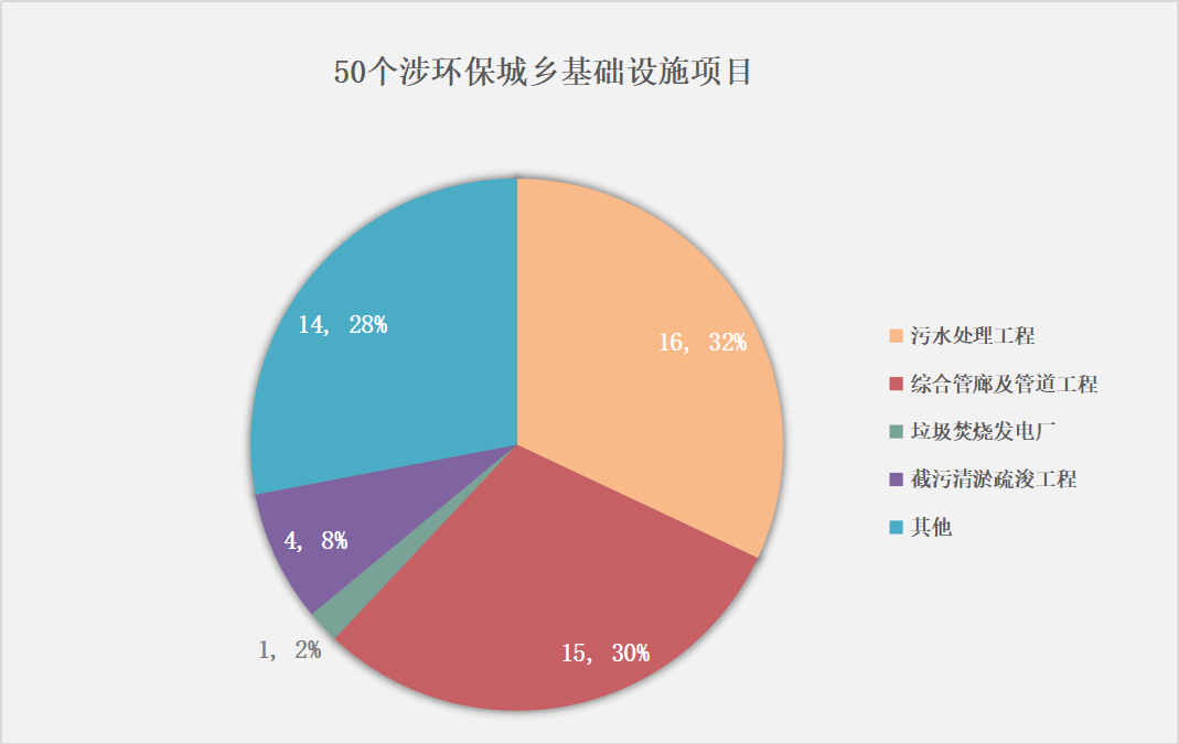 145個(gè)城鄉(xiāng)基礎(chǔ)設(shè)施項(xiàng)目中,有50個(gè)項(xiàng)目與環(huán)保息息相關(guān),涉及投資總額約247.6億元,年度計(jì)劃總投資約為34億元左右。