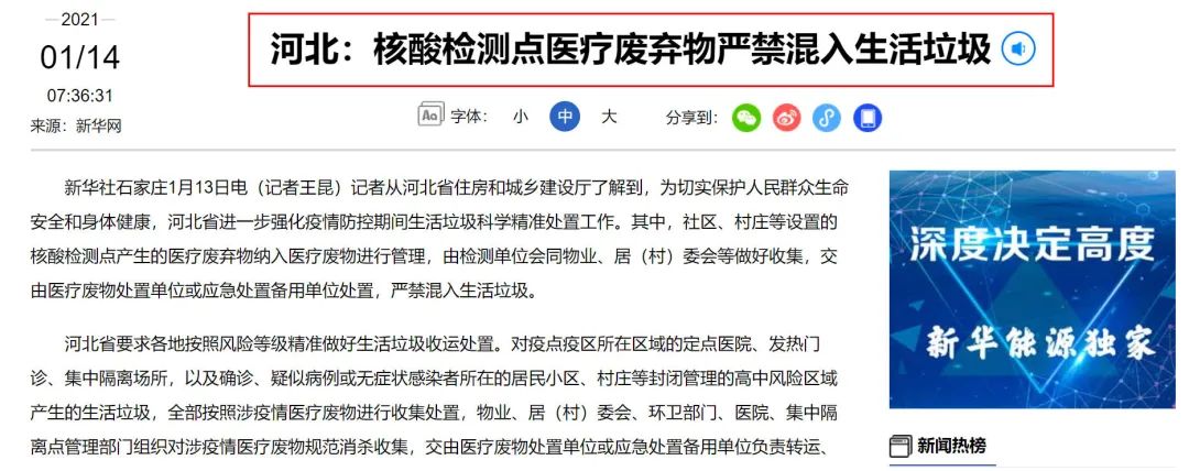 看得出來,其中可疑的傳播途徑之一,就是機場的拾荒者。而同一時間,同是在河北省,又恰好發(fā)生了另外一則新聞。1月14日,有網(wǎng)友爆料稱,自己所在的河北廊坊某小區(qū),有核酸檢測樣本被一名拾荒者丟棄在了垃圾桶,只是為了拿走裝核酸樣本的紙箱子。為此,小區(qū)居民不得不排長隊進行了第二次核酸檢測。這則新聞透露出一個信息,那就是核酸檢測點的醫(yī)療廢棄物(嚴(yán)格說核酸檢測樣本還不能稱之為“醫(yī)廢”)管理確實可能存在漏洞。一個尚且有用的核酸檢測樣本,都能被不相干的拾荒者撿走。那如果是沒有用處的醫(yī)療廢棄物,是不是更有可能流入拾荒者的手中?而在廊坊發(fā)生的例子,是否也有可能在石家莊重現(xiàn)?畢竟兩者同處于河北省的管理之下。聯(lián)想到此次石家莊的疫情,一個客觀存在的事實是——疫情集中暴發(fā)的幾個村子都位于石家莊正定國際機場附近。眾所周知,石家莊機場是首都機場重要的分流保障機場之一,疫情期間承擔(dān)了很多的分流保障任務(wù)。官方信息顯示,2020年,在經(jīng)停分流國際航班保障方面,石家莊機場被確定為了第一批分流北京國際航班入境點。10個月以來,該機場共保障入境航班和包機86班、入境人員1.77萬人次。雖然,石家莊機場表示,他們已經(jīng)采取了許多防疫措施,如國際航班保障人員實行集中住宿、封閉管理,與其他員工物理隔離;每周對處置專區(qū)進行常態(tài)化環(huán)境物表檢測,采樣點位置覆蓋頻繁與旅客發(fā)生接觸的服務(wù)設(shè)施以及空調(diào)風(fēng)管、出風(fēng)口,截至目前檢測結(jié)果均為陰性。但是,河北省健康管理學(xué)會發(fā)布的文章《石家莊疫霾下的三點再思考!》顯示,要認(rèn)識到管控措施的局限性。雖然國家在海關(guān)、機場、碼頭都采取了一系列管控措施,對進口物資、入境人員都認(rèn)真檢測,但是任何措施都不是萬能的,都可能存在著一定的漏洞。國際通道有可能管控不嚴(yán),或者是人與人的接觸,或者是物與人的接觸,或者是冷鏈產(chǎn)品的搬運,或者是垃圾廢棄物的處置,都有可能讓病毒有機可乘,偷偷地跑出來禍害人們。無論哪個環(huán)節(jié)管控不嚴(yán),都有可能出現(xiàn)問題。事實上,政府方面已經(jīng)注意到了可能存在的漏洞,并緊急出臺了相關(guān)規(guī)定。據(jù)新華社報道,1月13日,記者從河北省住房和城鄉(xiāng)建設(shè)廳了解到,為切實保護人民群眾生命安全和身體健康,河北省進一步強化了疫情防控期間生活垃圾科學(xué)精準(zhǔn)處置工作。其中,社區(qū)、村莊等設(shè)置的核酸檢測點產(chǎn)生的醫(yī)療廢棄物也納入醫(yī)療廢物進行管理,由檢測單位會同物業(yè)、居(村)委會等做好收集,交由醫(yī)療廢物處置單位或應(yīng)急處置備用單位處置,嚴(yán)禁混入生活垃圾。河北省要求,各地要按照風(fēng)險等級精準(zhǔn)做好生活垃圾收運處置。對疫點疫區(qū)所在區(qū)域的定點醫(yī)院、發(fā)熱門診、集中隔離場所,以及確診、疑似病例或無癥狀感染者所在的居民小區(qū)、村莊等封閉管理的高中風(fēng)險區(qū)域產(chǎn)生的生活垃圾,全部按照涉疫情醫(yī)療廢物進行收集處置,物業(yè)、居(村)委會、環(huán)衛(wèi)部門、醫(yī)院、集中隔離點管理部門組織對涉疫情醫(yī)療廢物規(guī)范消殺收集,交由醫(yī)療廢物處置單位或應(yīng)急處置備用單位負(fù)責(zé)轉(zhuǎn)運、處置。除以上情形的其他高、中風(fēng)險區(qū)域產(chǎn)生的生活垃圾,先經(jīng)消毒后再進行收運并焚燒等無害化處置。低風(fēng)險區(qū)域的生活垃圾,先經(jīng)消毒后再收運處置,做好垃圾桶、垃圾運輸車、垃圾轉(zhuǎn)運站、垃圾焚燒廠(填埋場)各環(huán)節(jié)的消殺工作,嚴(yán)禁收運未經(jīng)消殺的生活垃圾。同時,河北省還強化了口罩、手套等廢棄物管理。嚴(yán)格按照相關(guān)要求,設(shè)置廢棄口罩、手套收集專用桶,分類投放、集中收集、密閉轉(zhuǎn)運、焚燒處理。社區(qū)、村莊、物業(yè)企業(yè)等主動配合環(huán)衛(wèi)主管部門做好廢棄口罩、手套單獨收集、交接登記工作,完善各環(huán)節(jié)交接臺賬,嚴(yán)防丟失、遺散。亡羊補牢,未為晚也。希望河北省的這一教訓(xùn),也能引起其他省份的注意。從公開信息看,總的來說,目前石家莊的醫(yī)療廢棄物處置已基本到位。1月16日,在第12場新冠肺炎疫情防控工作新聞發(fā)布會上,石家莊市生態(tài)環(huán)境局副局長冀平表示,按照疫情防控的要求,新冠肺炎患者收治定點醫(yī)院、發(fā)熱病人篩查定點醫(yī)院、集中隔離醫(yī)學(xué)觀察場所、發(fā)熱門診、發(fā)現(xiàn)確診或疑似病例的居民小區(qū)(村莊)、核酸檢測點產(chǎn)生的醫(yī)療廢物(包括口罩、防護服、隔離衣、手套等)和生活垃圾,已經(jīng)全部納入新冠醫(yī)療廢物管理范圍。目前,石家莊市涉疫醫(yī)療廢物實施24小時一清運,普通醫(yī)療廢物實施48小時一清運。日常,石家莊市有4家醫(yī)廢處置單位,處置能力40噸/日,主要采用焚燒處置和微波消毒集中處理兩種工藝處置醫(yī)療廢物。而隨著疫情形勢的變化,醫(yī)療廢物產(chǎn)生量日益增加的趨勢,石家莊又應(yīng)急啟動了兩家新的符合條件的應(yīng)急處置單位。目前,石家莊市6家處置單位醫(yī)療