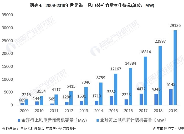 近幾年,全球海上風(fēng)力發(fā)電新增裝機(jī)容量呈現(xiàn)波動(dòng)上漲趨勢(shì),2019年,新增海上風(fēng)電裝機(jī)6.1GW,占全球新增裝機(jī)的10%。2019年,全球海上風(fēng)電累計(jì)裝機(jī)容量接近29.1GW,較上年同比增長(zhǎng)23%。