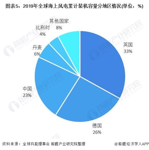 截止2019年底,歐洲繼續(xù)保持全球最大海上風(fēng)電市場(chǎng)地位,全球近69%的海上風(fēng)電設(shè)施位于11個(gè)歐洲國(guó)家的近海水域。其中,英國(guó)是目前全球最大的海上風(fēng)電市場(chǎng)國(guó),累計(jì)裝機(jī)容量9723MW,占全球裝機(jī)容量的33%;