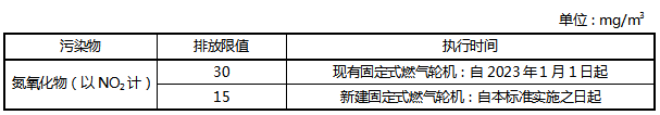 現(xiàn)有固定式燃?xì)廨啓C(jī)自2023年1月1日起執(zhí)行表1規(guī)定的氮氧化物排放限值。新建固定式燃?xì)廨啓C(jī)自本標(biāo)準(zhǔn)實(shí)施之日起執(zhí)行表1規(guī)定的氮氧化物排放限值。新建固定式燃?xì)廨啓C(jī)煙囪高度及距離周邊住宅的距離按批復(fù)的環(huán)境影響報(bào)告書(表)確定。
