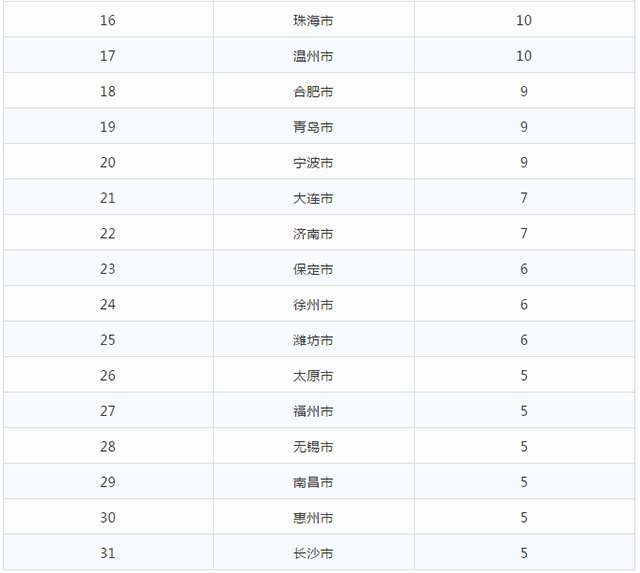 31座進(jìn)入名單城市中,直轄市4個(gè),省會(huì)城市12個(gè),計(jì)劃單列市4個(gè),其中11個(gè)城市均為三大經(jīng)濟(jì)圈地級(jí)市(“珠三角”、“長三角”、“環(huán)渤海”三大經(jīng)濟(jì)圈)。