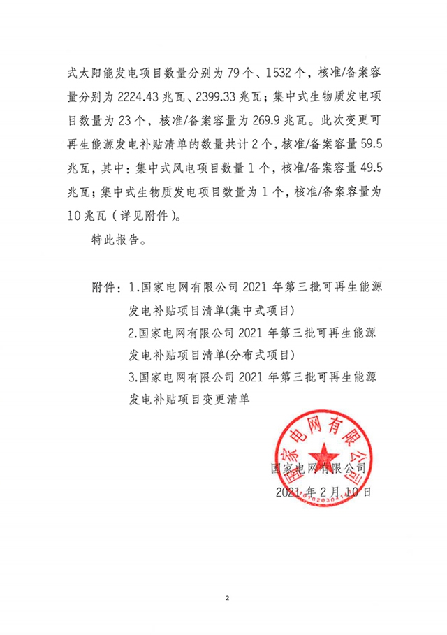 2021年2月10日,我公司已將完成公示的2021年第三批可再生能源發(fā)電項目補貼項目清單上報國家主管部門,第三批項目清單及后續(xù)項目審核進展情況,請登錄新能源云平臺查詢。