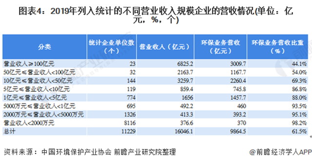 營(yíng)業(yè)收入規(guī)模越小的企業(yè),環(huán)保業(yè)務(wù)營(yíng)業(yè)收入在總營(yíng)業(yè)收入中所占比重越高,其環(huán)保專業(yè)化程度也越高,營(yíng)業(yè)收入超過(guò)l00億元的企業(yè),環(huán)保業(yè)務(wù)營(yíng)業(yè)收入平均占比為44.l%,營(yíng)業(yè)收入小于2000萬(wàn)元的企業(yè),其環(huán)保業(yè)務(wù)營(yíng)業(yè)收入平均占比達(dá)98.2%。