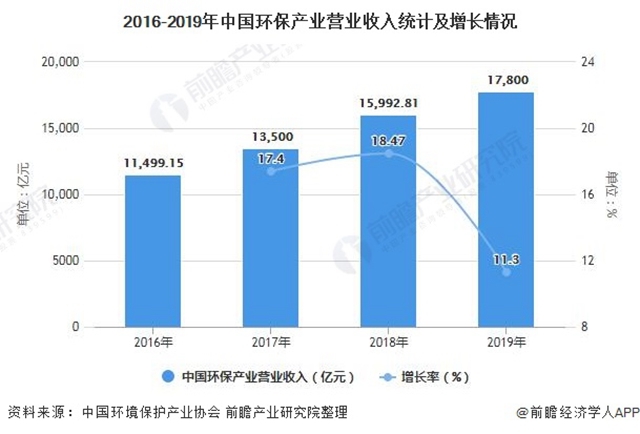 盡管受到2018年產(chǎn)業(yè)發(fā)展流動(dòng)性危機(jī)余波及中美貿(mào)易摩擦的影響,2019年一些環(huán)保企業(yè)依然面臨著經(jīng)營(yíng)危機(jī),但總體來(lái)看,2019年環(huán)保產(chǎn)業(yè)整體發(fā)展態(tài)勢(shì)趨好,持續(xù)保持了較快發(fā)展。據(jù)中國(guó)環(huán)境保護(hù)產(chǎn)業(yè)協(xié)會(huì)測(cè)算數(shù)據(jù),2019年全國(guó)環(huán)保產(chǎn)業(yè)營(yíng)業(yè)收入約17800億元,較2018年增長(zhǎng)約11.3%。