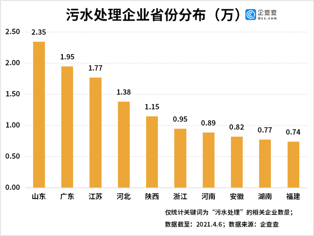 從地域分布來看,企查查數(shù)據(jù)顯示,山東省的污水處理相關(guān)企業(yè)數(shù)量最多,達(dá)2.35萬家。排名2-5位的廣東、江蘇、河北和陜西,分別有污水處理企業(yè)1.95萬家、1.77萬家、1.38萬家和1.15萬家。
