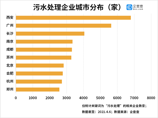 從城市分布來看,企查查數(shù)據(jù)顯示,西安的污水處理相關(guān)企業(yè)數(shù)量最多,共6798家,在所有城市中排名第一。排名2-5位的廣州、長沙、南京和成都,分別有污水處理企業(yè)5639家、4044家、3353家和3314家。