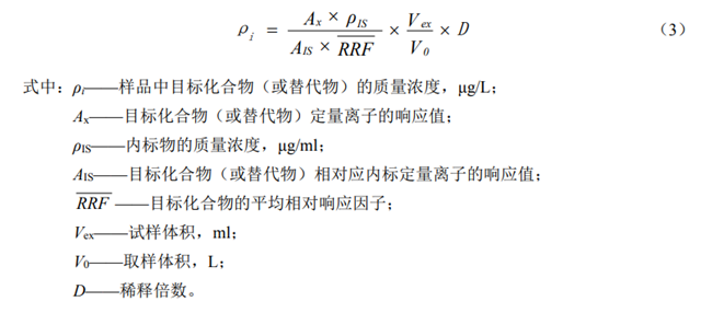 當(dāng)目標(biāo)化合物(或替代物)采用平均相對(duì)響應(yīng)因子進(jìn)行校準(zhǔn)時(shí),樣品中目標(biāo)化合物(或替代物)的質(zhì)量濃度(μg/L),按照公式(3)進(jìn)行計(jì)算: