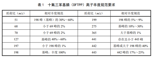 每次分析前,應(yīng)進(jìn)行質(zhì)譜自動(dòng)調(diào)諧,再將氣相色譜和質(zhì)譜儀設(shè)定至分析方法要求的儀器條件,并處于待機(jī)狀態(tài),通過(guò)氣相色譜進(jìn)樣直接注入 1.0 µl 十氟三苯基膦使用液(4.15),對(duì)整個(gè)系統(tǒng)進(jìn)行檢查,每運(yùn)行 12 h 檢查一次,得到十氟三苯基膦質(zhì)譜圖,其質(zhì)量碎片的離子的豐度應(yīng)全部符合表 1 中的要求。否則須清洗質(zhì)譜儀離子源。