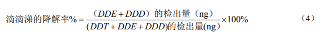 用色譜進(jìn)樣口檢查液(4.8)來(lái)檢查氣相色譜儀注射入口的惰性,滴滴涕(DDT)到滴滴伊(DDE)和滴滴滴(DDD)的降解率不應(yīng)超過(guò) 15%,滴滴涕的降解率按公式(4)進(jìn)行計(jì)算。如果 DDT 衰減過(guò)多或出現(xiàn)較差的色譜峰,則需要清洗或更換進(jìn)樣口,同時(shí)還應(yīng)截取毛細(xì)管柱前段約5 cm。聯(lián)苯胺和五氯苯酚等極性化合物在進(jìn)樣口易出現(xiàn)分解,峰形出現(xiàn)拖尾分裂等現(xiàn)象,也應(yīng)進(jìn)行同樣的處理。