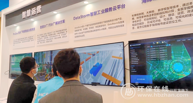墻面遍布電子屏,ProSee污水廠專家智能決策系統(tǒng)、智慧水廠/污水廠解決方案、DataStorm智慧工業(yè)服務(wù)云平臺、海綿城市智慧管控平臺展示,有沒有越看越覺得很有科技范兒?
