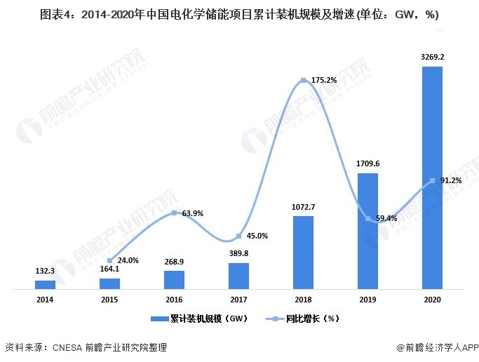 截至2020年底,電化學(xué)儲(chǔ)能累計(jì)裝機(jī)規(guī)模為3269.2MW,同比增長(zhǎng)91.2%。未來(lái)五年,隨著分布式光伏、分散式風(fēng)電等分布式能源的大規(guī)模推廣,電化學(xué)儲(chǔ)能行業(yè)將面臨更廣闊的市場(chǎng)機(jī)遇。