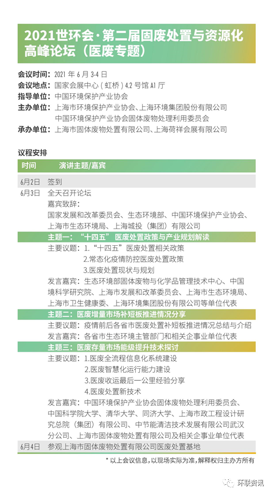 為持續(xù)完善醫(yī)療廢物處置機制、守好“末端”防線,助力全國醫(yī)療廢物處置補短板能力建設,提升醫(yī)廢收運處置能力與水平,推進《醫(yī)療廢物處理處置污染控制標準》的貫徹實施,2021年6月2日-3日將在上海舉辦“2021世環(huán)會·第二屆固廢處置與資源化高峰論壇(醫(yī)廢專題)”。