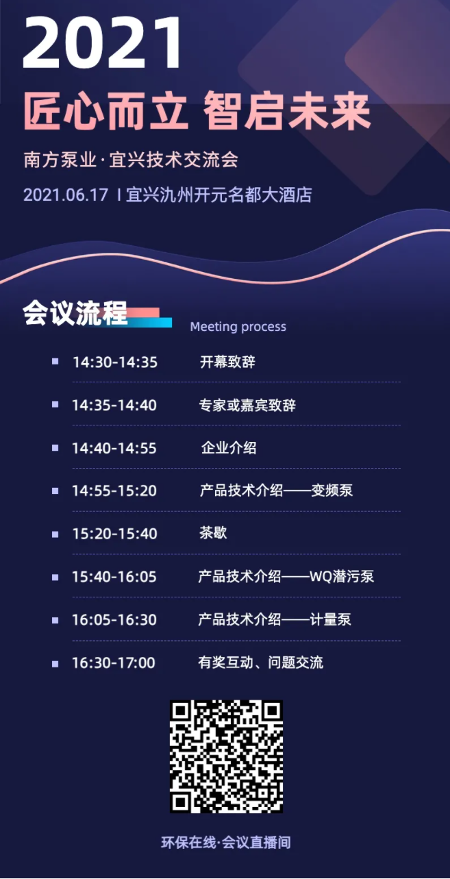 鎖定“匠心而立 智啟未來”南方泵業(yè)2021年宜興地區(qū)技術(shù)交流會,鎖定宜興環(huán)保城,鎖定環(huán)保在線,6月17日,咱們不見不散!