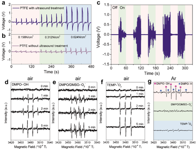 進一步,本研究通過施加外力并測量開路電壓來揭示 PTFE 駐極體的壓電特性(圖 3a、b)。 隨著外加壓力從 0.156 增加到 0.624 N/cm2,開路電壓從 0.5 V增加到 1.8 V。此外,活化的PTFE膜在超聲波的作用下能產(chǎn)生可重現(xiàn)的壓電電壓(圖 3c)。這揭示了惰性的PTFE超聲催化活性的基本過程及機制,包括1) PTFE在超聲壓力場下的駐極化活化,以及2) 高頻超聲壓力波持續(xù)刺激壓電PTFE駐極體產(chǎn)生迅速交變的內(nèi)部電場,從而驅(qū)動電荷到PTFE/水界面并最終產(chǎn)生ROS (圖 3d, e, f)。