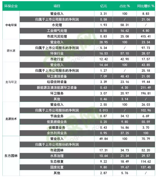 以水環(huán)境治理、固廢處理和煙氣治理的中電環(huán)保上半年實現(xiàn)營業(yè)收入為3.31億元,較去年同期增長8.83%;實現(xiàn)歸屬于上市公司股東的凈利潤0.58億元,較去年同期增長21.06%。