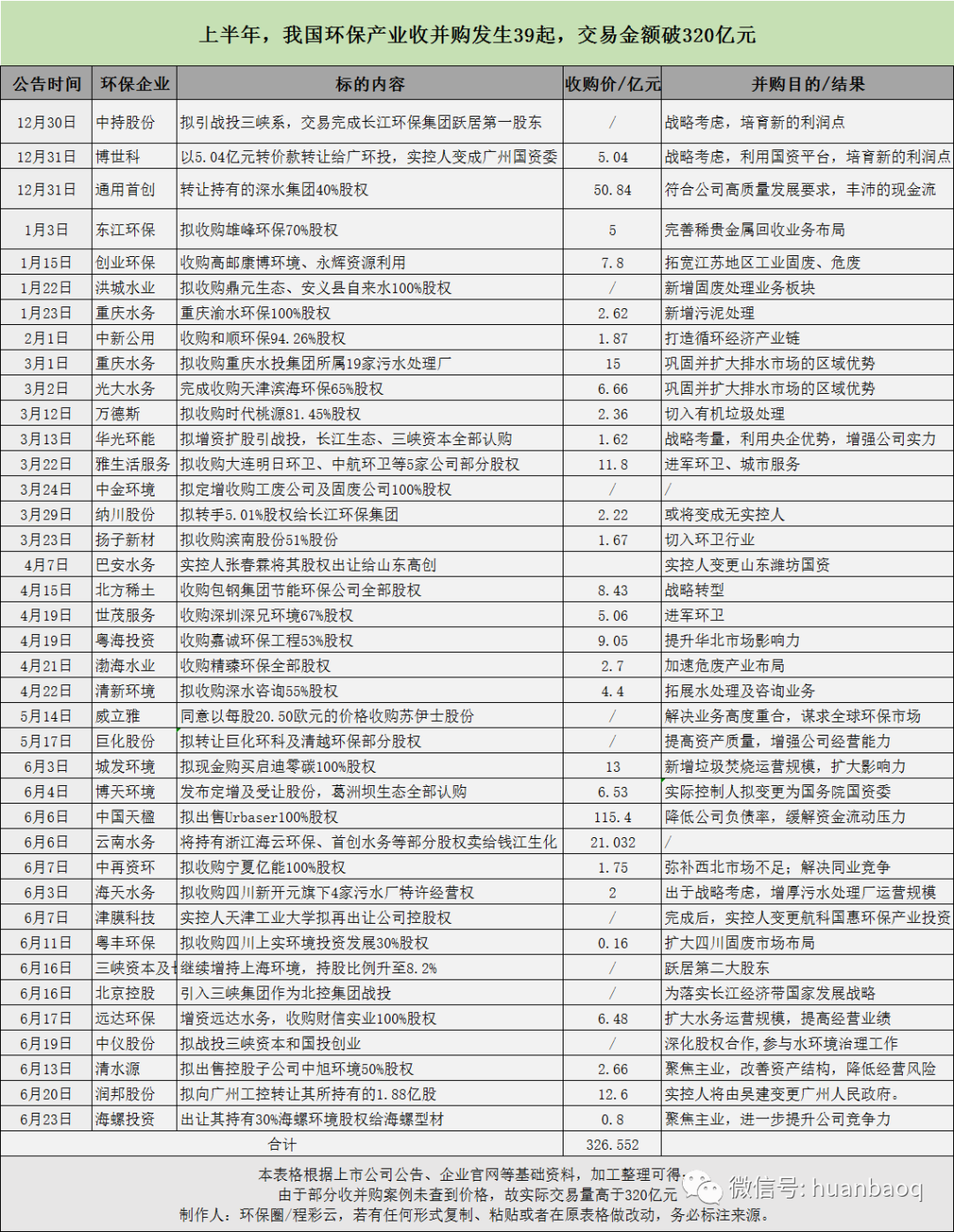 原標(biāo)題:國資兇猛!上半年環(huán)保行業(yè)并購交易資金突破320億,創(chuàng)歷史之最