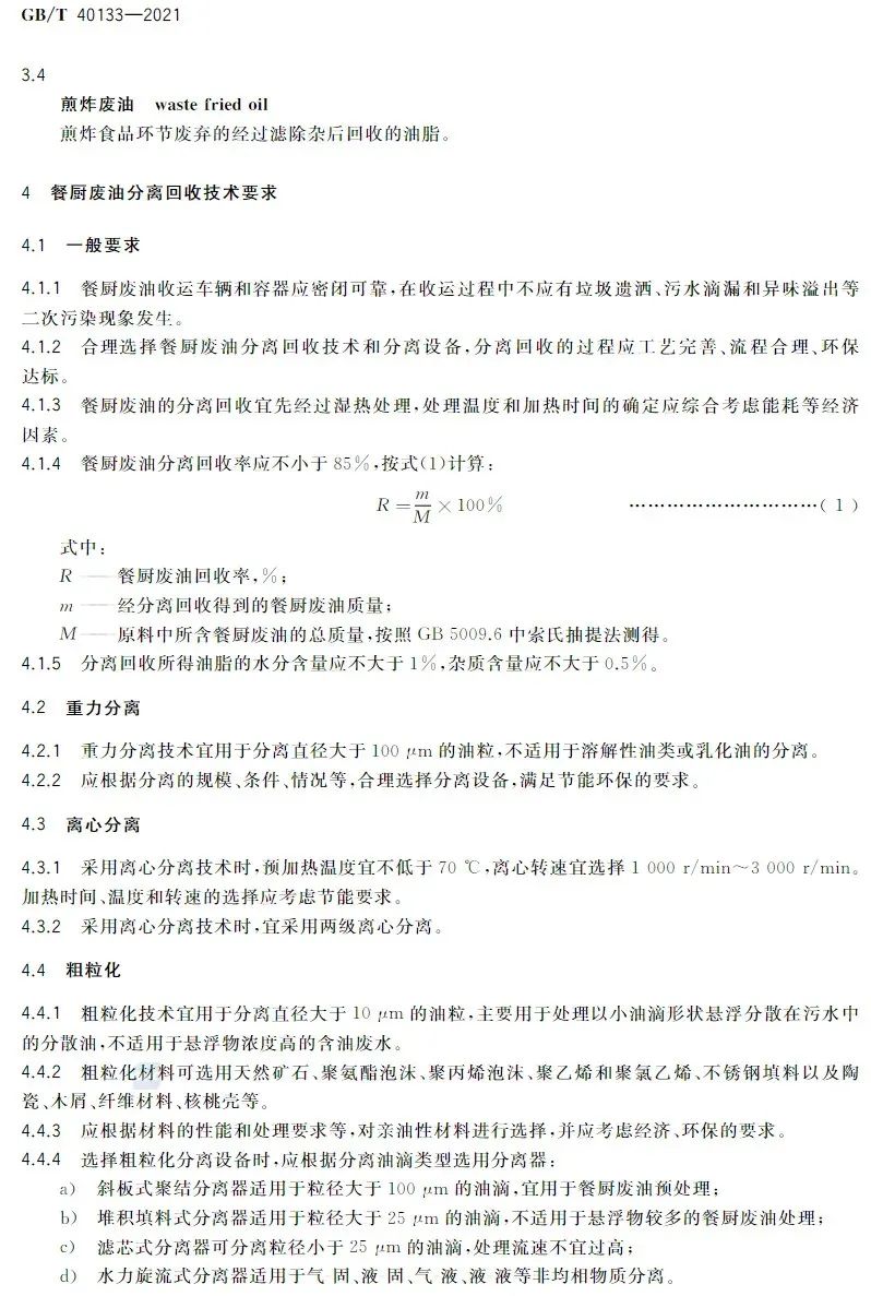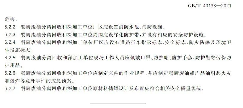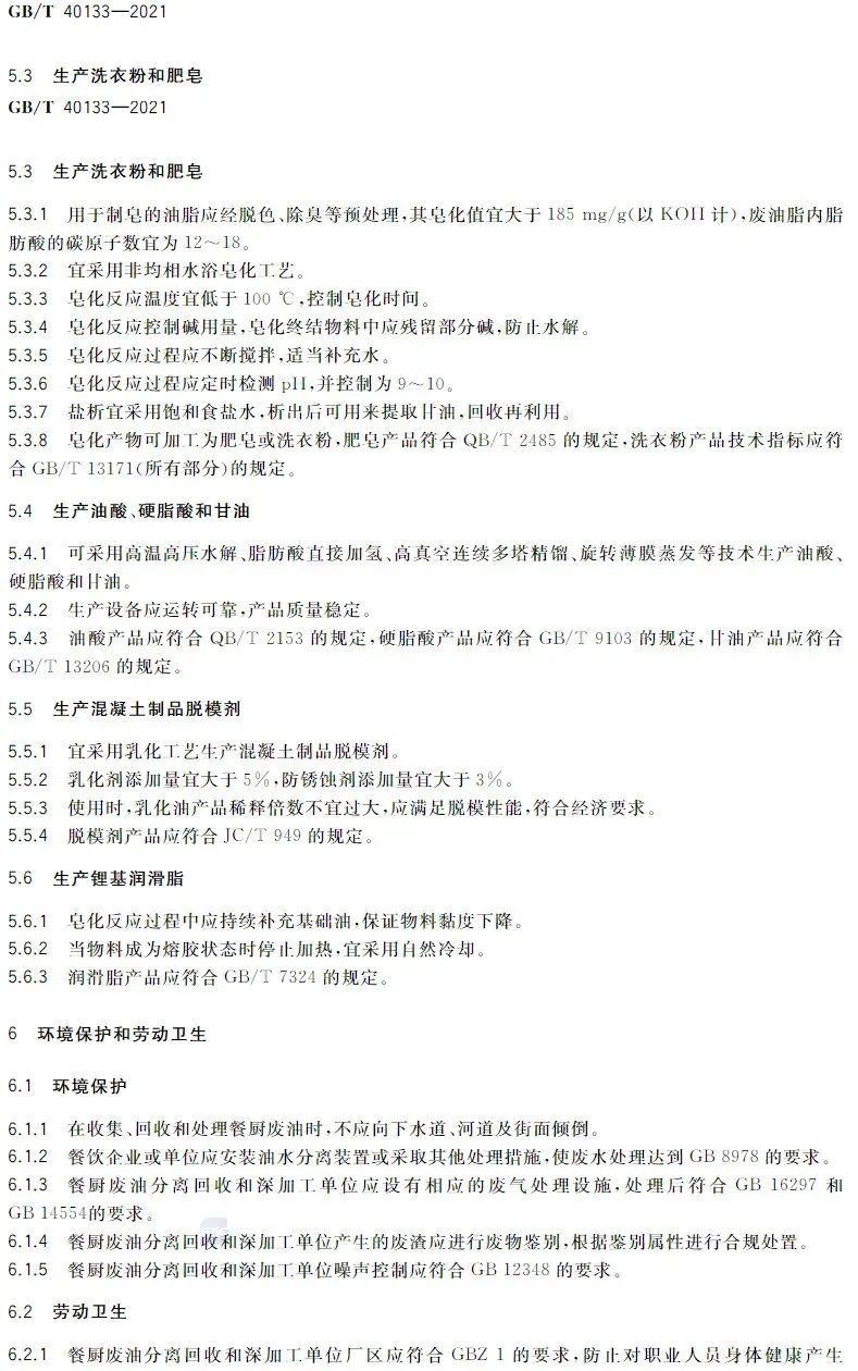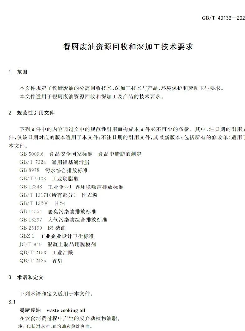 該國標對餐廚廢油的分離回收技術(shù)、深加工技術(shù)與產(chǎn)品及環(huán)境保護和勞動衛(wèi)生做出規(guī)范要求,是我國第一項餐廚廢油回收和深加工技術(shù)的國家標準,改觀了餐廚廢油資源回收和深加工處于有技術(shù)、無標準的狀態(tài),對于餐廚廢油資源回收和深加工及產(chǎn)品具有深遠的指導(dǎo)性意義。