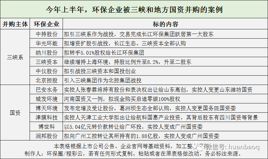 圖一:6月環(huán)保行業(yè)收并購(gòu)案例比較著名的,業(yè)內(nèi)反響比較大的事件有:一,有著行業(yè)環(huán)?!熬逕o(wú)霸”之稱三峽系,這邊忙著與北控達(dá)成戰(zhàn)略投資,那邊增持上海環(huán)境,還順帶投資了管網(wǎng)修復(fù)企業(yè)中儀股份,繼續(xù)“一統(tǒng)江湖”,擴(kuò)大自己“朋友圈”。