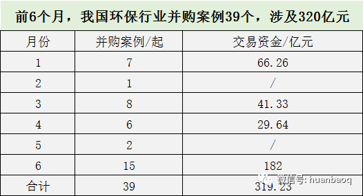 無(wú)論出于何種目的和戰(zhàn)略考慮,今年上半年較之往年,我國(guó)環(huán)保行業(yè)收并購(gòu)活動(dòng)都顯得異常頻繁,產(chǎn)業(yè)兼并重組一浪高過(guò)一浪,幾乎每個(gè)月都有企業(yè)“賣賣賣”,小至某個(gè)污水處理廠、垃圾焚燒廠股權(quán)出售,大至整個(gè)公司實(shí)控人發(fā)生變更。據(jù)《環(huán)保圈》不完全統(tǒng)計(jì),今年上半年,國(guó)內(nèi)環(huán)保產(chǎn)業(yè)累計(jì)發(fā)生的收并購(gòu)案例高達(dá)39起,涉及320億元交易資金(由于部分案例未找到收購(gòu)價(jià)格,故實(shí)際交易資金遠(yuǎn)大于320億元)。僅6月,行業(yè)發(fā)生的收購(gòu)案例就達(dá)15起、交易規(guī)模達(dá)200億元。(如圖二所示)
