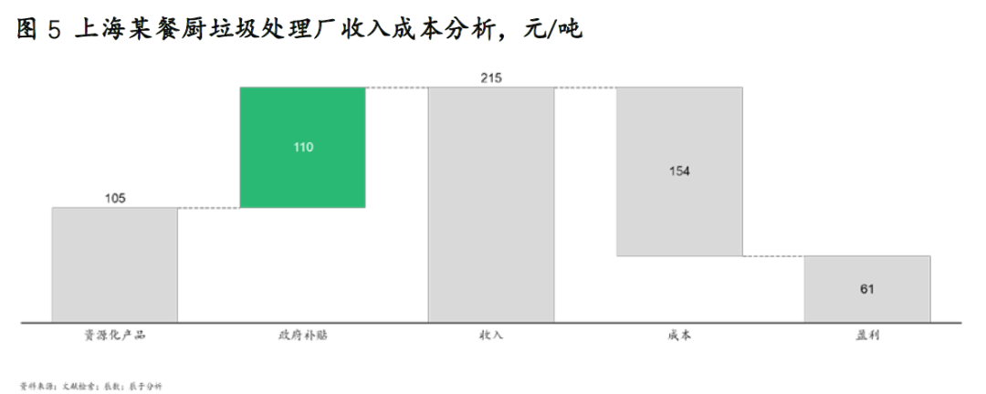 由于沼氣、粗油脂等資源化產(chǎn)物產(chǎn)量少、應(yīng)用有限,在當(dāng)前技術(shù)工藝下,餐廚垃圾處理的資源化價(jià)值很難獲得規(guī)模性與經(jīng)濟(jì)性,商業(yè)模式尚未完全走順暢。目前我國政府對(duì)餐廚垃圾企業(yè)實(shí)行運(yùn)行補(bǔ)貼和收運(yùn)補(bǔ)貼,具體金額大小受技術(shù)、地區(qū)、試點(diǎn)發(fā)展過程、項(xiàng)目處理量等因素影響。調(diào)研發(fā)現(xiàn),由于資源化產(chǎn)品盈利有限,難以覆蓋全部成本,餐廚垃圾處理企業(yè)的盈利當(dāng)前主要依靠政府補(bǔ)貼(見圖5)。