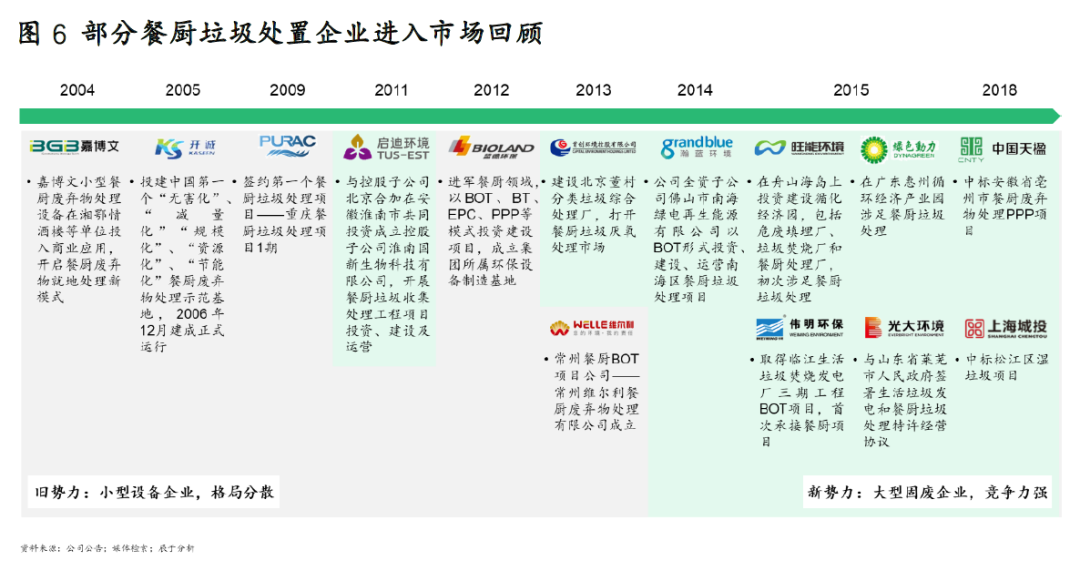 回顧我國餐廚垃圾處理行業(yè)的發(fā)展歷程,可以看到過去十幾年由于市場(chǎng)規(guī)模小、發(fā)展慢,并未引起足夠重視,主要是一些小型設(shè)備企業(yè)“小打小鬧”,市場(chǎng)比較分散,競(jìng)爭(zhēng)并不激烈。不過近幾年,隨著垃圾分類帶來的需求激增,包括光大環(huán)境、中國天楹、上海城投等大型固廢企業(yè)紛紛進(jìn)入,硝煙四起(見圖6)。