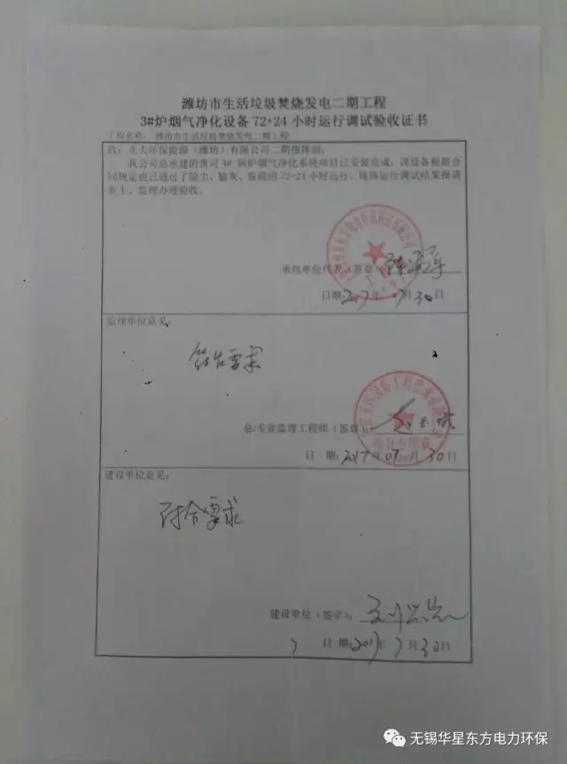 2017年7月30日,我公司承建的山東濰坊3x500t/d生活垃圾焚燒廠二期工程通過72+24小時試運行。