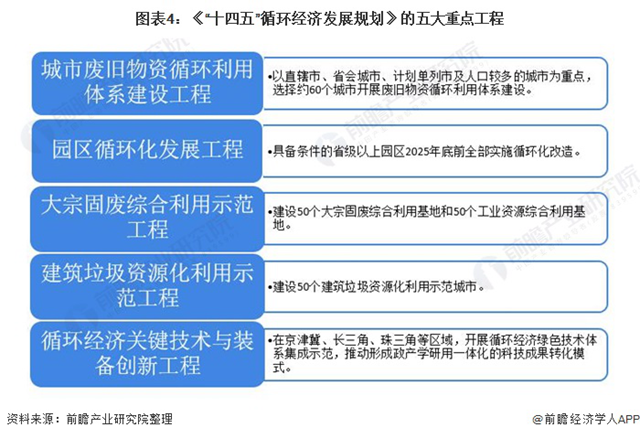 《規(guī)劃》還提出了重點(diǎn)工程與行動(dòng),共有五大重點(diǎn)工程和六大重點(diǎn)行動(dòng)。五大重點(diǎn)工程分別為城市廢舊物資循環(huán)利用體系建設(shè)工程、園區(qū)循環(huán)化發(fā)展工程、大宗固廢綜合利用示范工程、建筑垃圾資源化利用示范工程和循環(huán)經(jīng)濟(jì)關(guān)鍵技術(shù)與裝備創(chuàng)新工程。