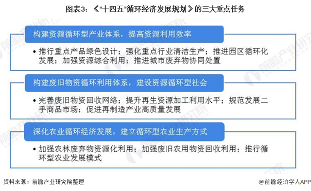 《規(guī)劃》提出了三大重點(diǎn)任務(wù)包括:構(gòu)建資源循環(huán)型產(chǎn)業(yè)體系,提高資源利用效率;構(gòu)建廢舊物資循環(huán)利用體系,建設(shè)資源循環(huán)型社會;深化農(nóng)業(yè)循環(huán)經(jīng)濟(jì)發(fā)展,建立循環(huán)型農(nóng)業(yè)生產(chǎn)方式。
