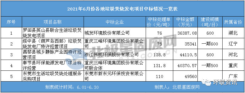2021年6月垃圾焚燒發(fā)電項(xiàng)目累計(jì)中標(biāo)5個(gè),涉及總投資金額超20億人民幣。具體垃圾焚燒發(fā)電項(xiàng)目中標(biāo)情況匯總?cè)缦拢?/span>
