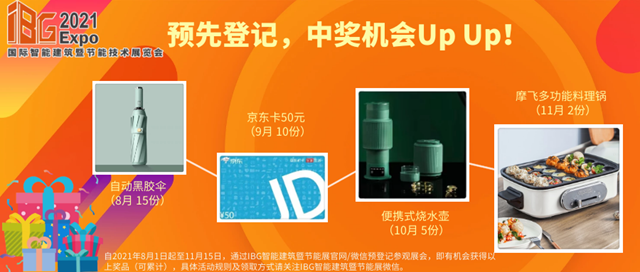 據(jù)悉,“IBG國際智能建筑暨節(jié)能技術(shù)展覽會”觀眾預(yù)登記已開啟,自8月開始至11月預(yù)登記的觀眾有機(jī)會享自動黑膠傘、京東卡、便攜式燒水壺、摩飛多功能料理鍋等實(shí)用好禮!活動獎品可累計,越早登記中獎機(jī)會越多。主辦方期待于2021年11月30日-12月2日與更多業(yè)內(nèi)人士相聚上海新國際博覽中心,共筑智能建筑生態(tài)圈!