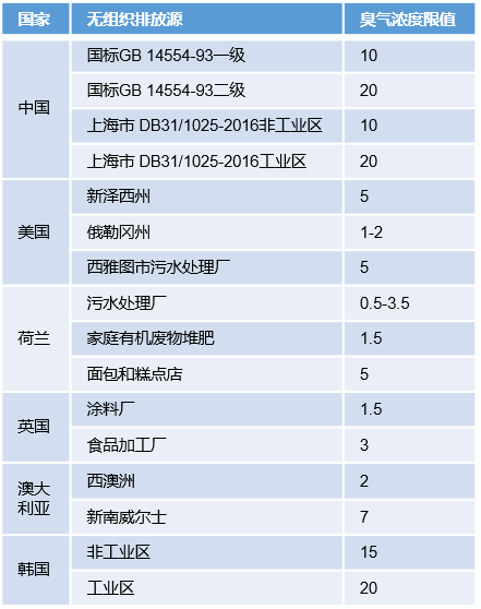 大多數(shù)國家和地區(qū)的臭氣濃度標(biāo)準(zhǔn)用于污染管理指導(dǎo),規(guī)定臭氣濃度標(biāo)準(zhǔn)的應(yīng)用范圍不盡相同。不同地區(qū)使用的臭氣濃度由于測(cè)量方式差異導(dǎo)致單位不同:如澳大利亞使用OU、荷蘭使用OUE/m3、美國使用D/T,韓國使用OC,而國際上對(duì)臭氣濃度的定義是一致的,因此1OU=1OU/m3 = 1OUE/m3 = 1OC= 1D/T。上海市《惡臭(異味)污染物排放標(biāo)準(zhǔn)》(DB31/1025-2016)規(guī)定的非工業(yè)區(qū)臭氣濃度及氨、三甲胺、甲硫醇、甲硫醚等組分濃度在國內(nèi)均最嚴(yán)。