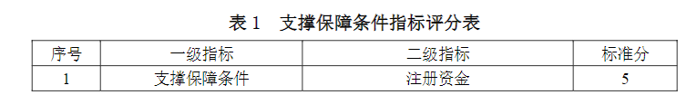 支撐保障條件指標(biāo)包括環(huán)境咨詢(環(huán)保管家)服務(wù)單位的注冊(cè)資金、上年度營(yíng)業(yè)收入、員工數(shù)量、職稱、質(zhì)量管理體系以及業(yè)務(wù)培訓(xùn)6項(xiàng)二級(jí)指標(biāo)。支撐保障條件指標(biāo)評(píng)分見表1。