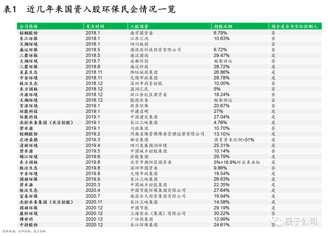 據(jù)不完全統(tǒng)計(jì),從2018年開(kāi)始,頭部環(huán)保民營(yíng)企業(yè)“投身”國(guó)資的趨勢(shì)加快,從2018年到2020年,有超過(guò)34家民營(yíng)企業(yè)迎來(lái)國(guó)資的入股,超過(guò)50%的企業(yè)實(shí)際控制人變更為國(guó)資(見(jiàn)表1)。