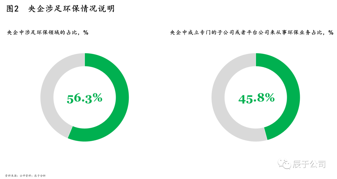 央企在關(guān)系到國(guó)民經(jīng)濟(jì)命脈的主要行業(yè)和關(guān)鍵領(lǐng)域占據(jù)支配地位,而生態(tài)環(huán)保是國(guó)家的千年大計(jì),不少央企正把目光瞄準(zhǔn)生態(tài)環(huán)保領(lǐng)域,將生態(tài)環(huán)保作為未來(lái)發(fā)展的新賽道。據(jù)初步統(tǒng)計(jì),在96家央企中,有超過(guò)四成都專(zhuān)門(mén)成立了從事生態(tài)環(huán)保業(yè)務(wù)或開(kāi)創(chuàng)生態(tài)環(huán)保業(yè)務(wù)的子公司、平臺(tái)(見(jiàn)圖2),例如中交集團(tuán)下屬中國(guó)城鄉(xiāng)控股集團(tuán)有限公司,中國(guó)鐵建下屬中鐵建發(fā)展集團(tuán)有限公司等,他們對(duì)生態(tài)環(huán)保的重視可見(jiàn)一斑。