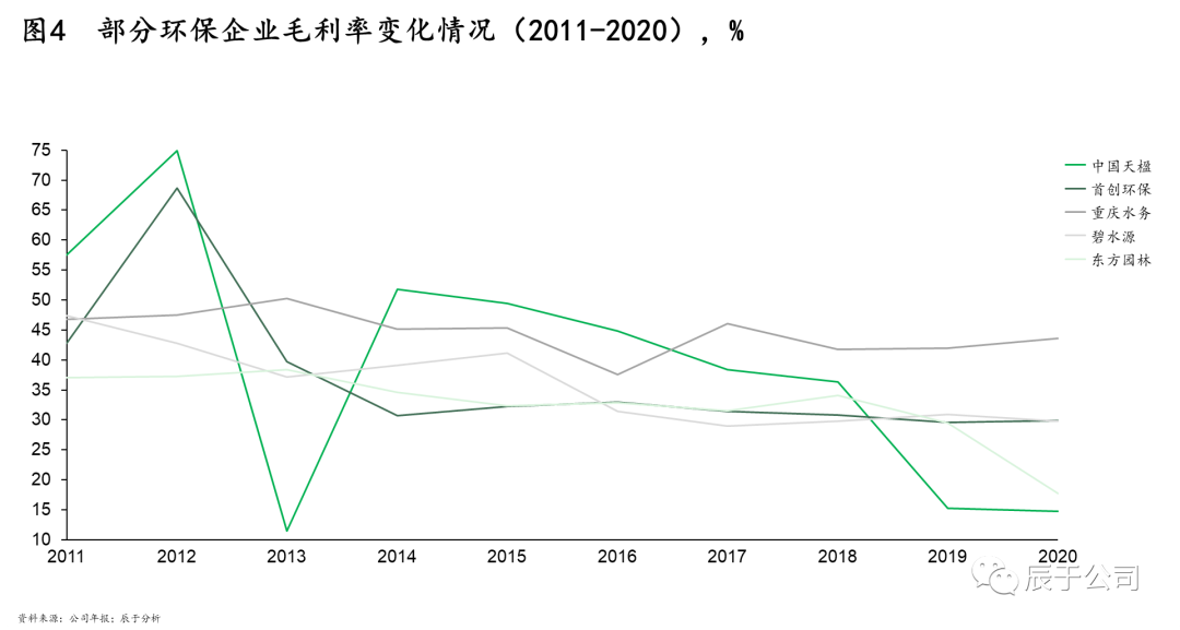 因此,地方政府一方面想辦法壓低項(xiàng)目盈利水平降低投入,一方面尋求其他“合法”融資渠道解困。近年來(lái)大型生態(tài)環(huán)保企業(yè)的盈利水平逐步下降印證了項(xiàng)目盈利降低的趨勢(shì)(見(jiàn)圖),盈利就幾個(gè)點(diǎn),融資成本極低的大型國(guó)企、央企在競(jìng)爭(zhēng)中處于優(yōu)勢(shì),幾個(gè)點(diǎn)的融資成本決定了項(xiàng)目的成與否;尋找融資渠道下,地方生態(tài)環(huán)保集團(tuán)應(yīng)運(yùn)而生,對(duì)跨市統(tǒng)籌、投資公益性回報(bào)比較差的項(xiàng)目等,將起到積極的作用。
